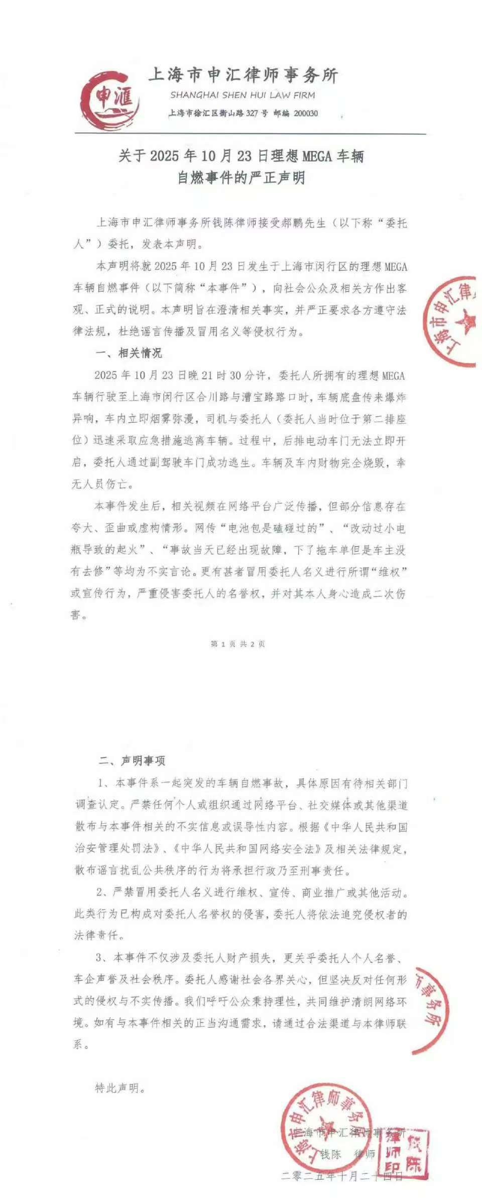 DoNews10月24日消息,针对昨晚一辆理想MEGA在行驶途中突然起火股票配资公司倍杠杆,当事人委托律师严正声明:2025年10月23日晚21时30分许,委托人所拥有的理想MEGA车辆行驶至上海市闵行区合川路与漕宝路路口时,车辆底盘传来爆炸异响,车内立即烟雾弥漫,司机与委托人(委托人当时位于第二排座位)迅速采取应急措施逃离车辆。